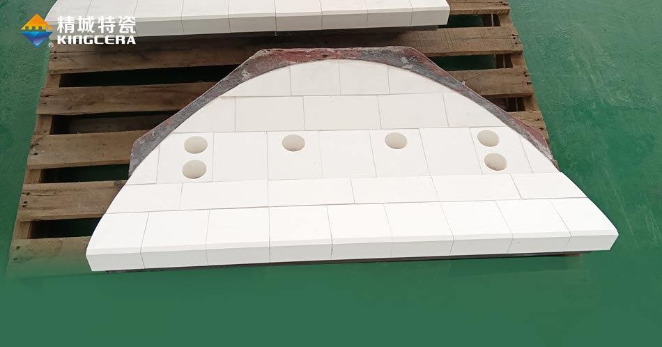 綜合以上分析,再結合成本等要素,精城特瓷開發出了鋼廠擋料板防磨方案。擋料板將兩種耐磨陶瓷結合使用,擋料板下方沖擊力較大的地方采用ZTA耐磨陶瓷,擋料板上方沖擊力較小的地方則采用95氧化鋁耐磨陶瓷,這樣既能滿足擋料板的使用需求,又能節省成本。陶瓷安裝采用燕尾卡槽安裝法,可以保證擋料板在高溫環境下穩定運行。該方案已經在多家鋼廠使用,得到客戶高度認可。