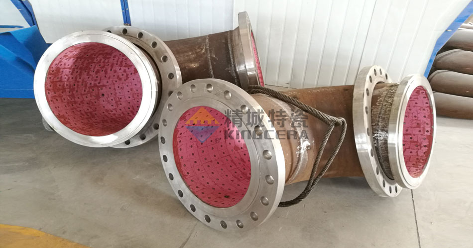 2. 安裝方法:耐磨陶瓷的安裝方法也對陶瓷的耐高溫能力有直接影響。比如使用普通陶瓷粘膠粘貼陶瓷,它所能承受的高溫范圍就在150℃左右,精城特瓷的特制陶瓷粘膠可以將這個溫度提升到350℃,但是一旦超過粘膠的耐溫范圍,粘膠的粘性就會急劇下降,容易引起陶瓷脫落。與粘貼法相比,螺柱焊接法以及燕尾卡槽安裝的陶瓷就可以耐750℃的高溫。精城新研發生產的整體成型耐磨陶瓷管道更是可以大大削弱安裝方法對陶瓷耐溫能力的限制。